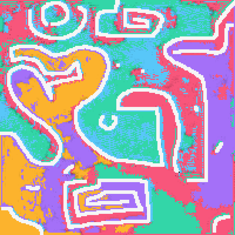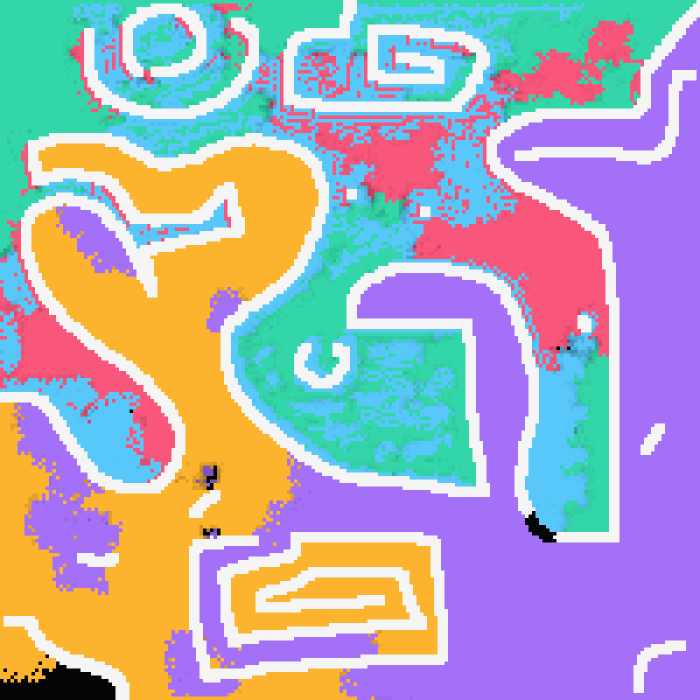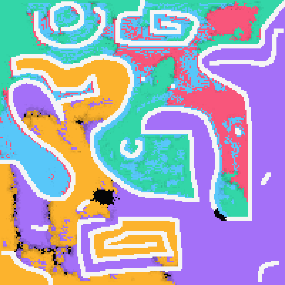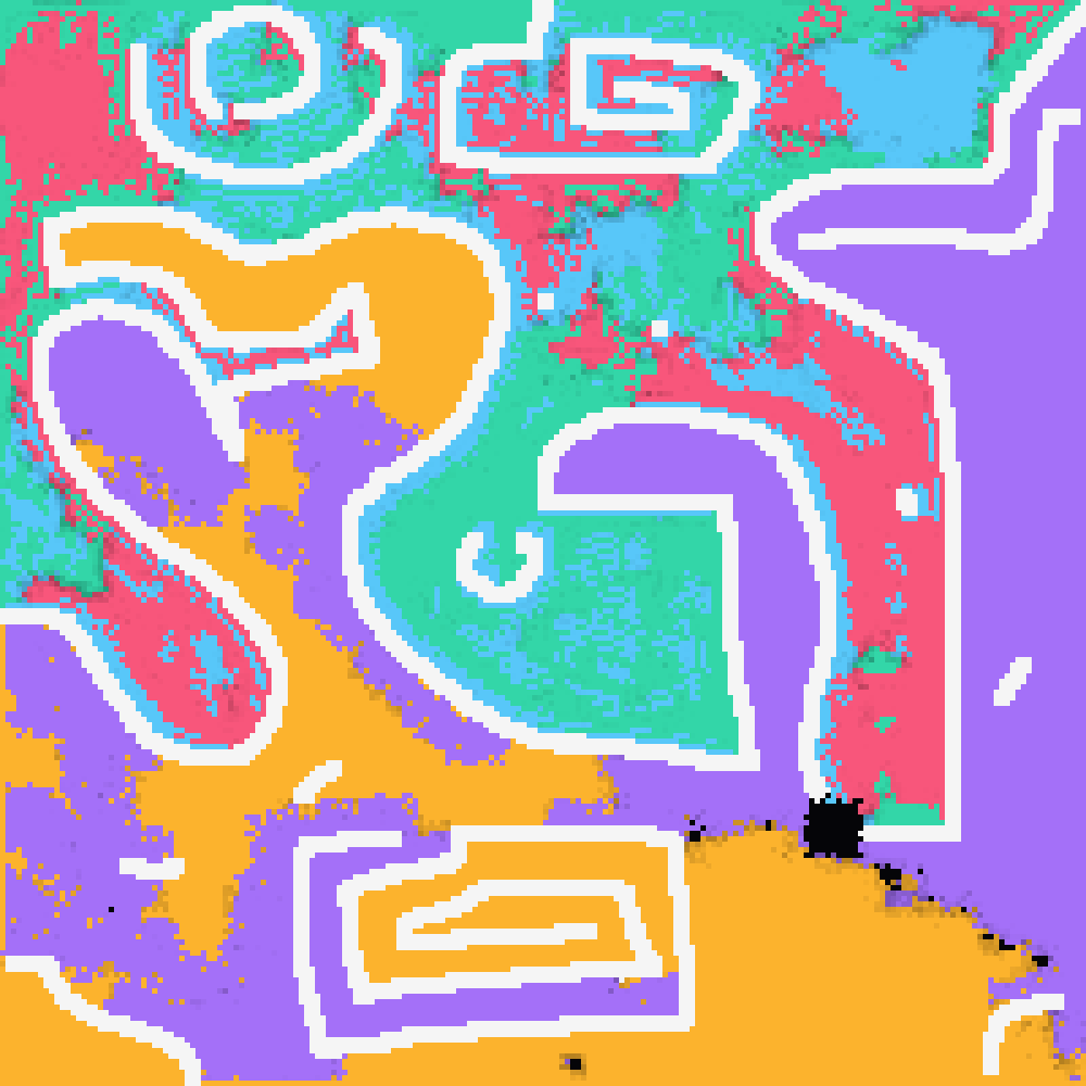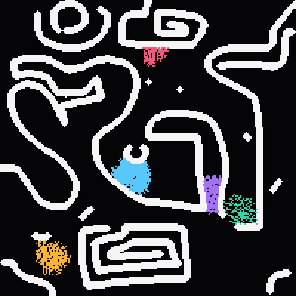 This case study perturbs the environment rather than parameters. We painted an intricate wall field on a 200×200 grid and seeded five species by hand, then ran SGD with τ=0.99, thr=0.43, lr$=1.3 \times 10^{-3}$.