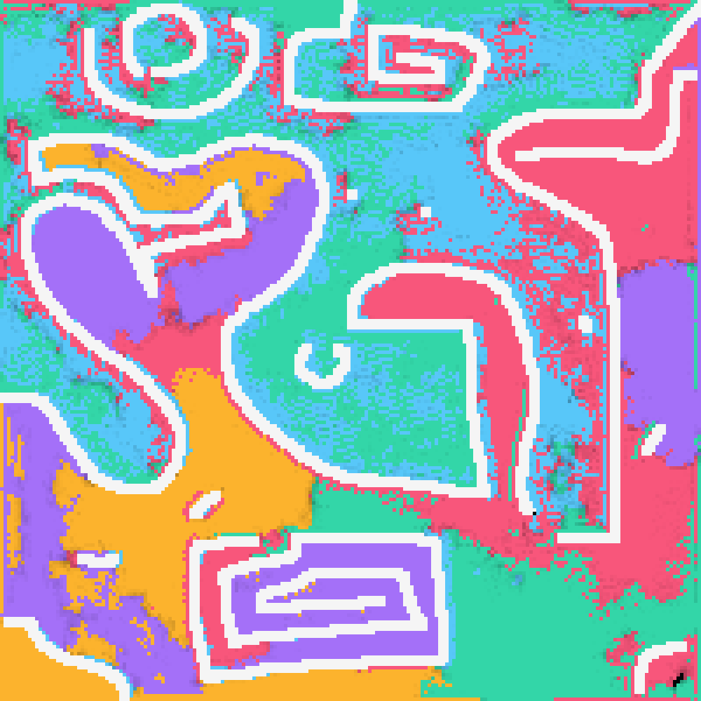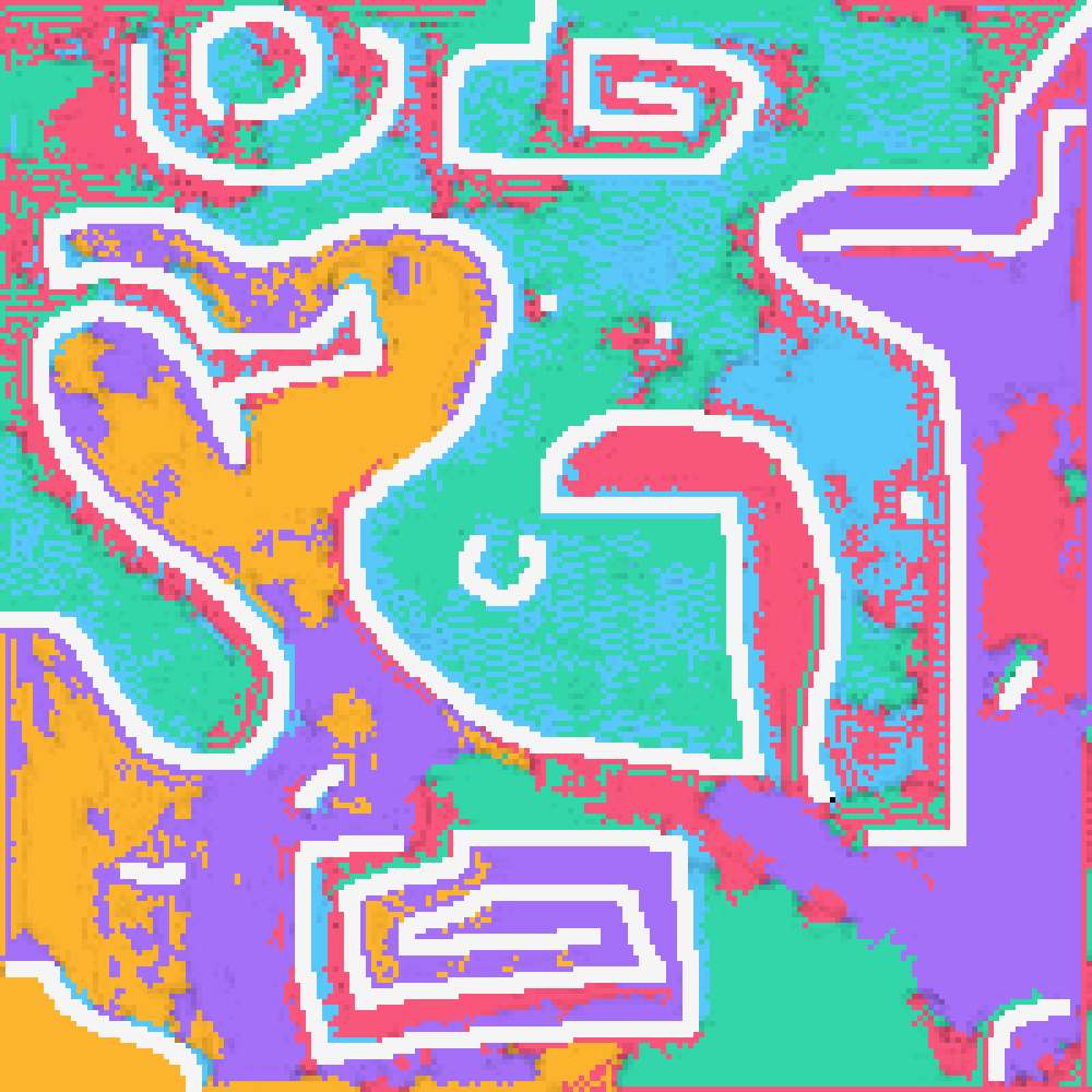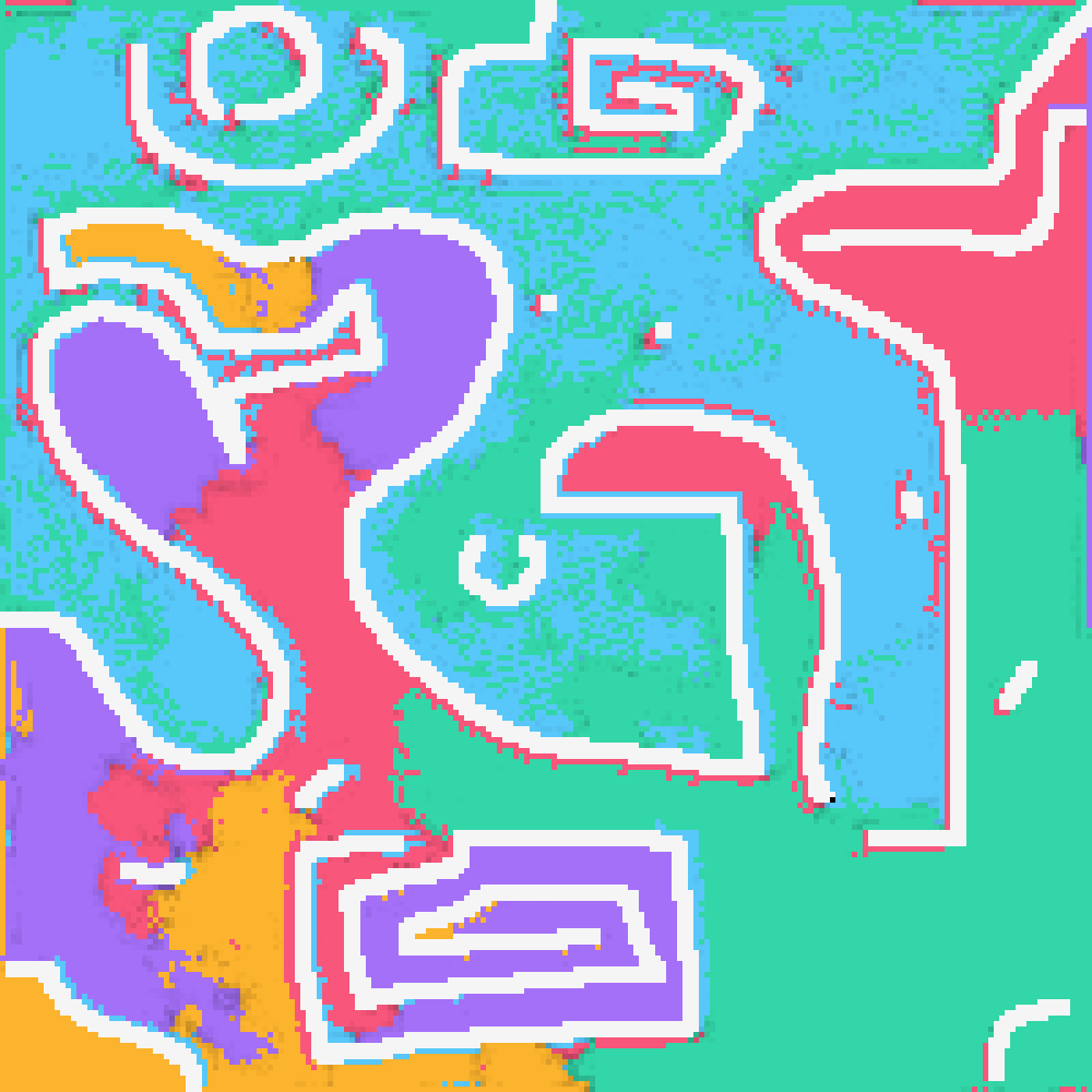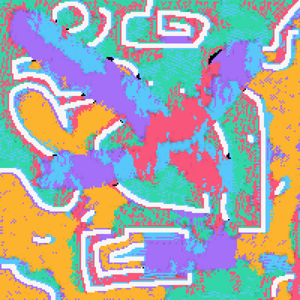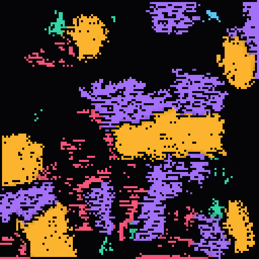 Five neural species competing on a shared grid. Each colour is an independently learning cellular automaton.