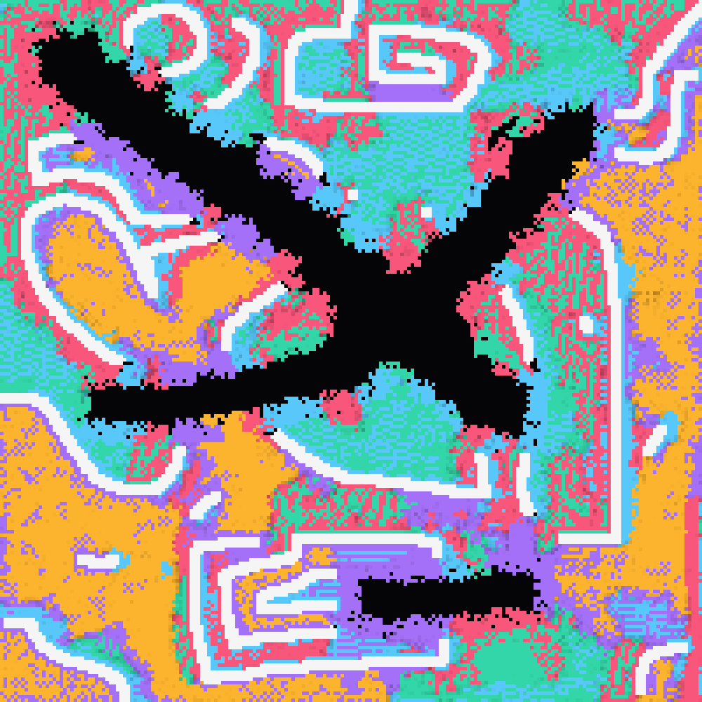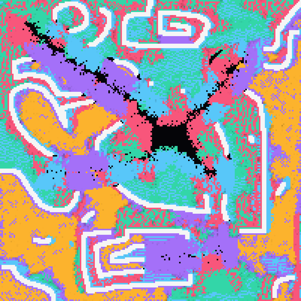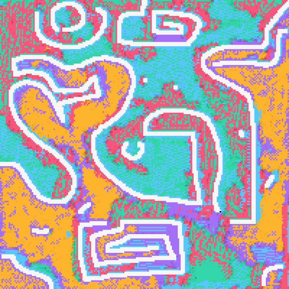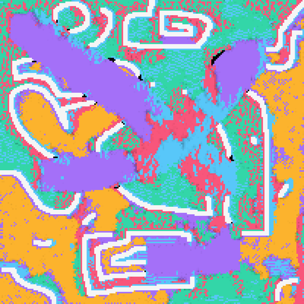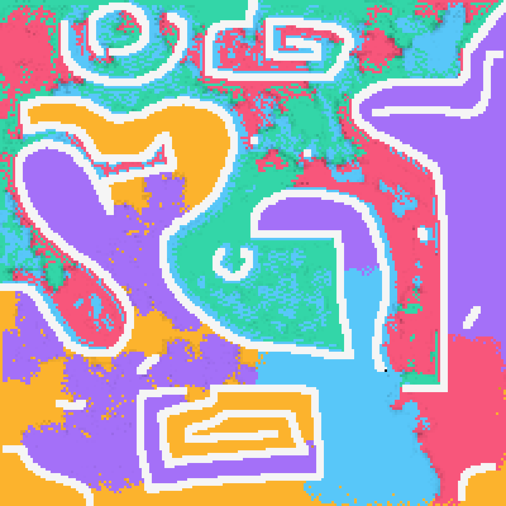 Five neural species competing on a shared grid. Each colour is an independently learning cellular automaton.