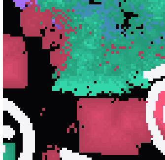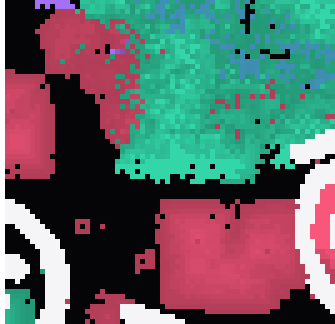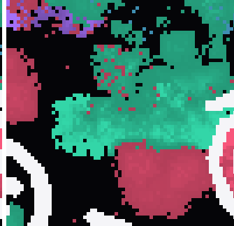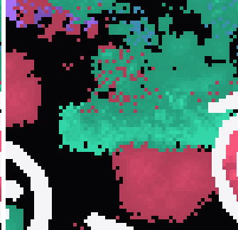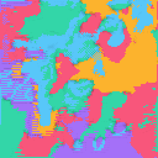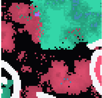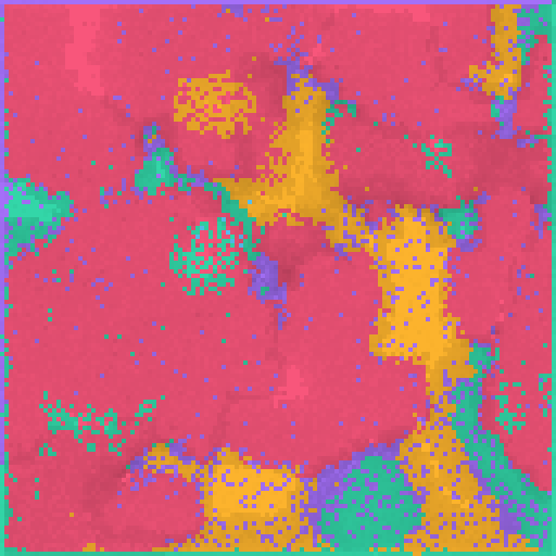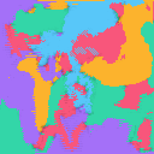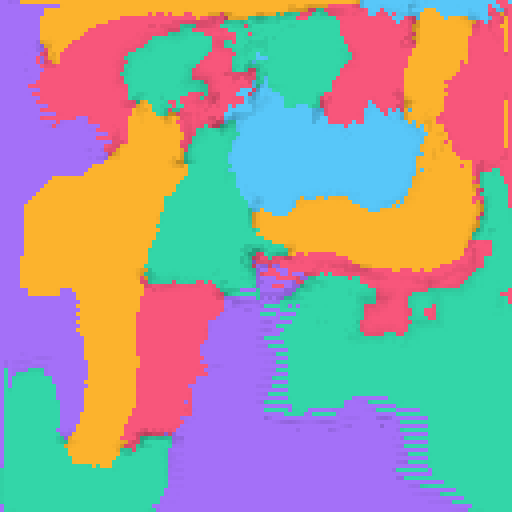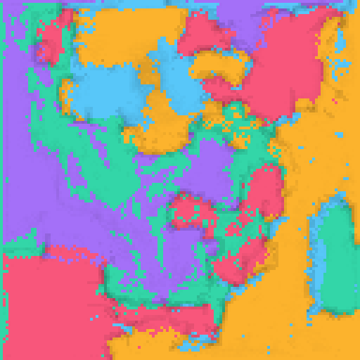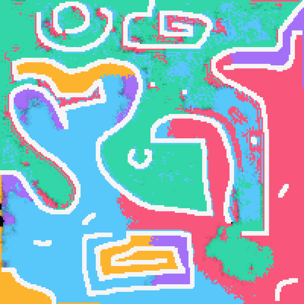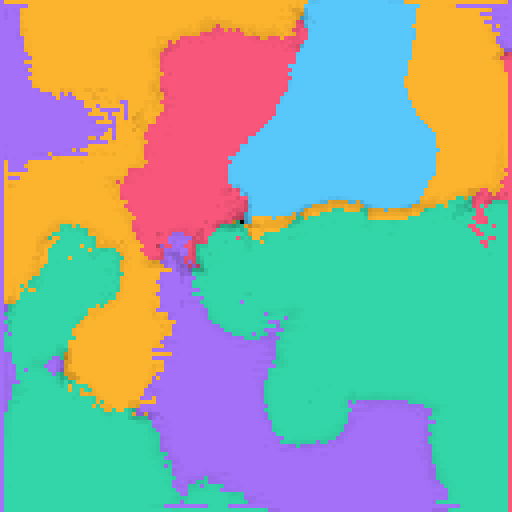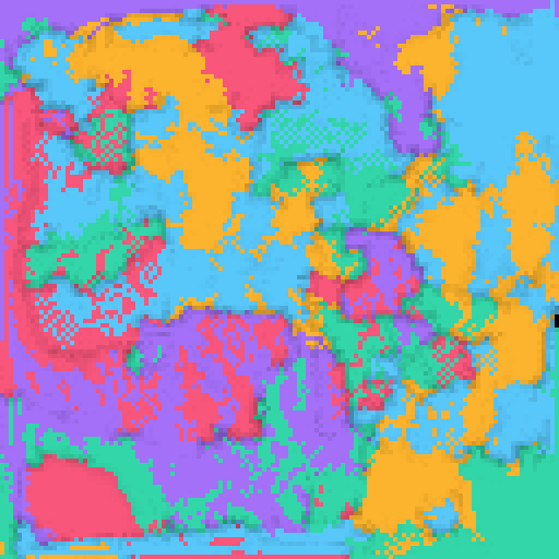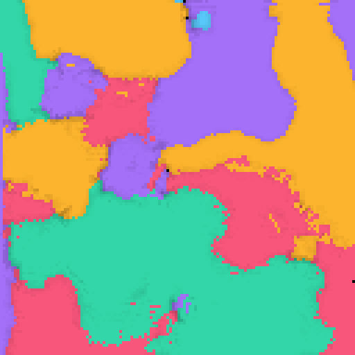 Reduce thr to 0.39. Former neighbours begin sharing territory.