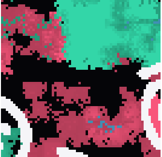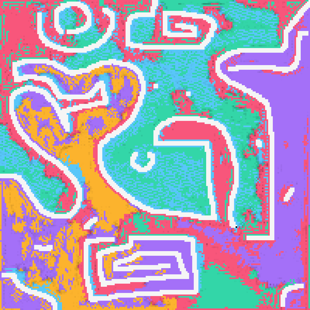 At τ=0.1 (the GUI slider labelled "Sharpness"), the inter-species softmax is nearly one-hot. Small fluctuations determine the per-cell winner on each step, and that winner flips the next step as the losing species' gradients catch up. The result is a persistent flicker-mixing attractor: every pixel flickers between species on every step, yet the system as a whole is stable.