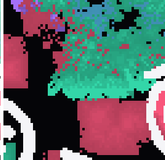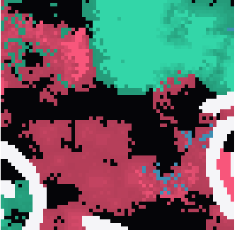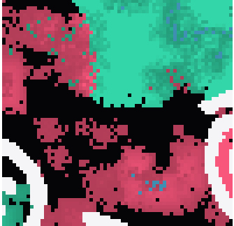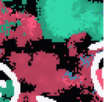 where a~i(x,y) is the 3×3 max-pooled aliveness of species i, θ is the survival threshold (default 0.5), and kgate is the steepness. The species' new alpha channel becomes ait+1=wi⋅gi, where wi is the competition weight.