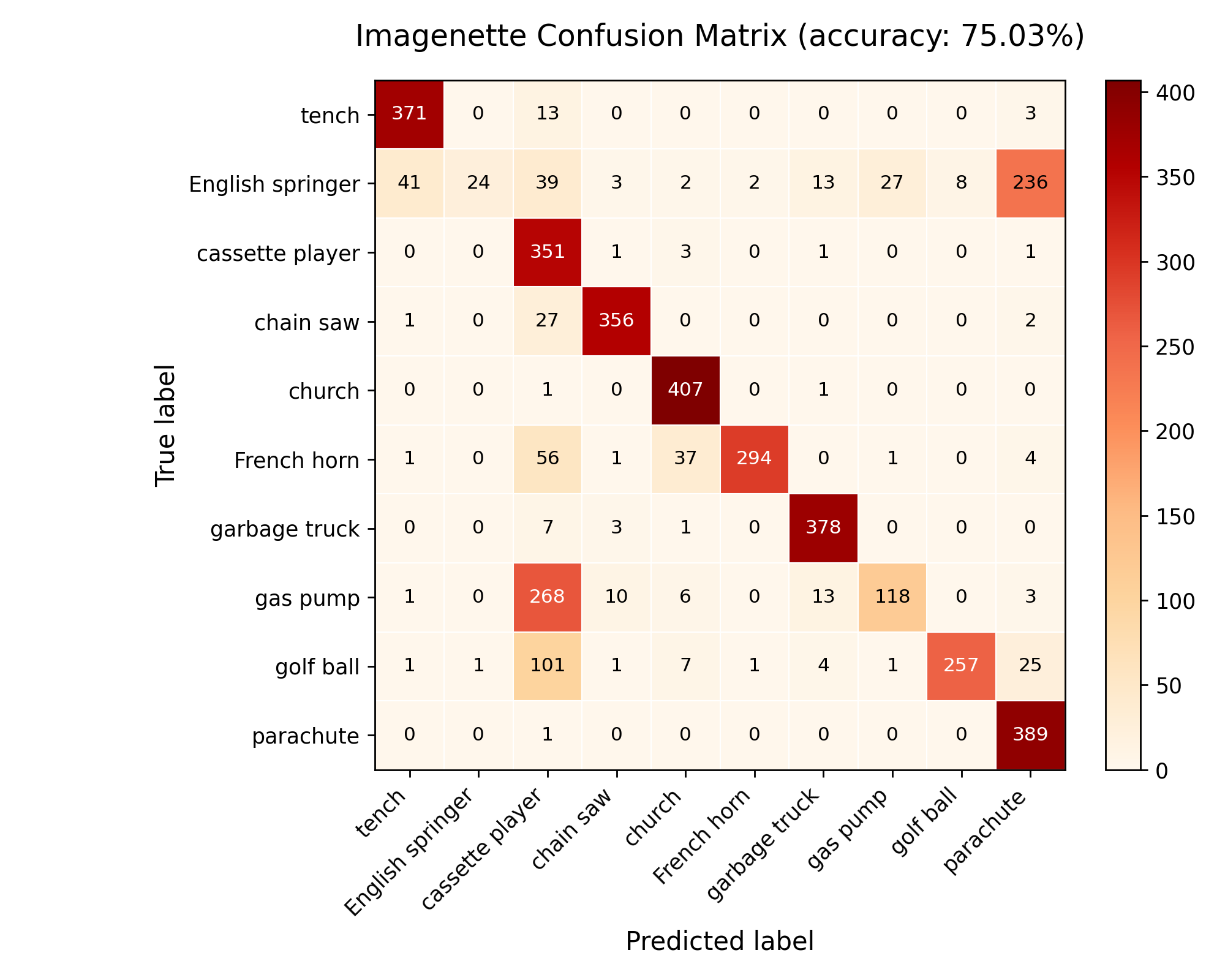 We find that the answer can be “yes” to a surprising degree. On the 10‑class Imagenette subset of ImageNet, the target text-only model reaches 75.03% accuracy purely through information stored in the generated LoRA adapter. This result is remarkable as neither the hypernetwork nor the base model have seen any visual tokens during training.