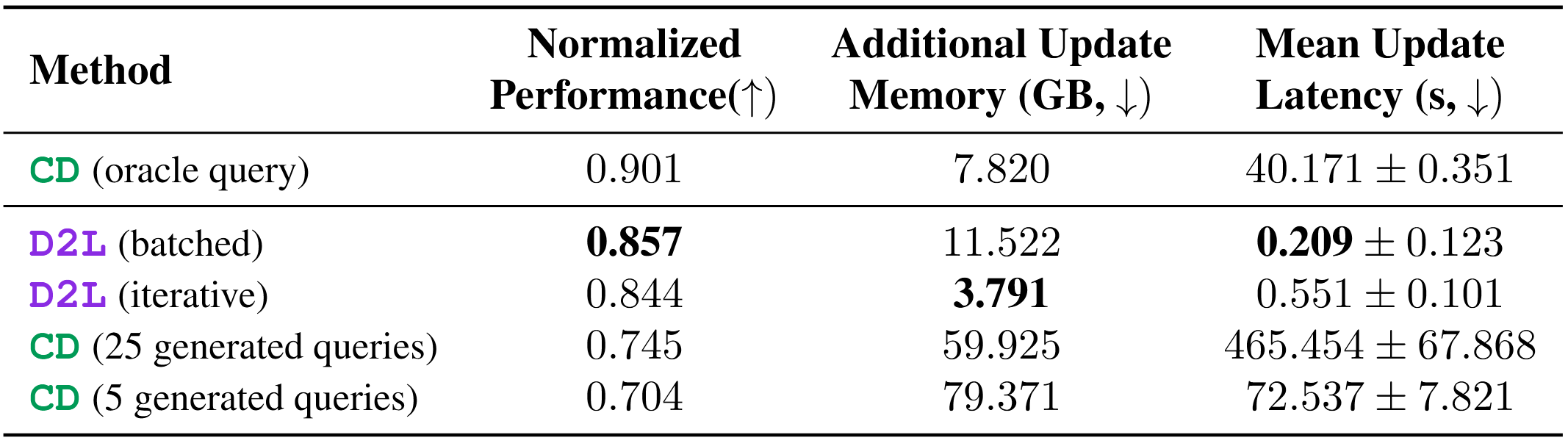 Long-context QA tasks pose a real challenge for standard distillation due to memory and compute constraints. We note that test samples can go up to 32K tokens, far beyond Doc-to-LoRA's longest training example (2,344 tokens). Doc-to-LoRA can generalize beyond its training length thanks to the chunking mechanism. Doc-to-LoRA achieves 85% relative accuracy, again with sub-second update latency. Oracle CD scores higher at 90% but takes 40 seconds and requires more than 7 GB VRAM. The longer the document, the bigger this advantage. For full technical details, see our paper.