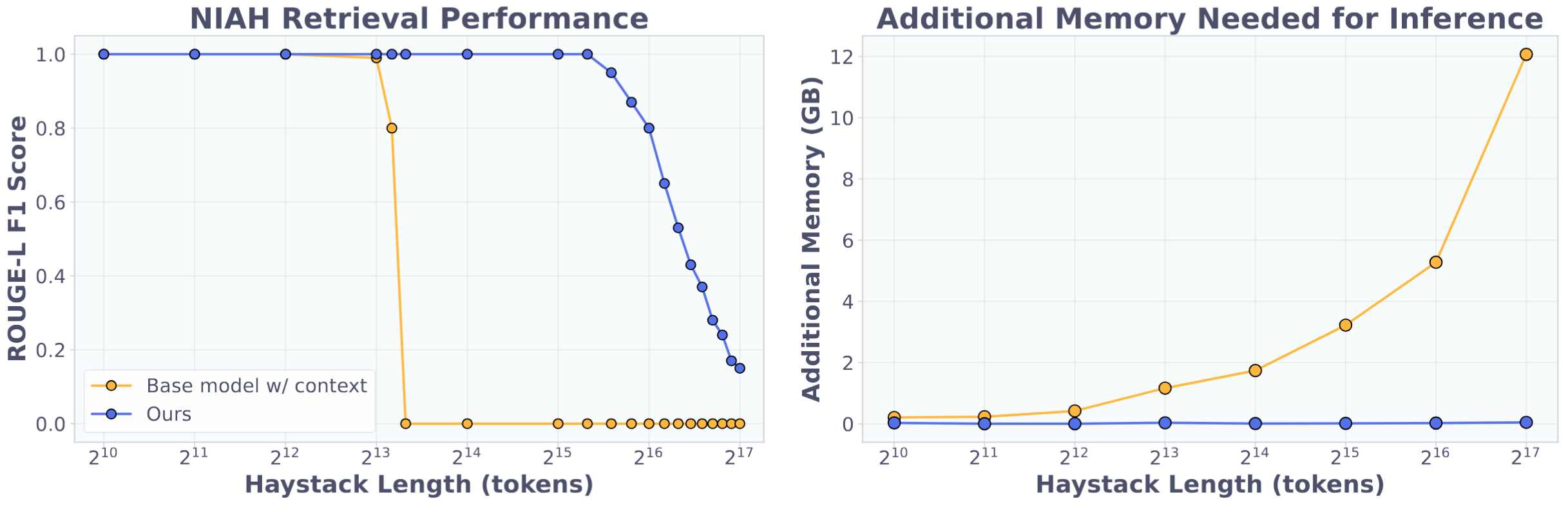 During evaluation, the baseline has direct access to both the haystack and the query. For D2L, the base LLM does not have direct access to any part of the original context but is simply given the query prompt. Doc-to-LoRA segments the haystack into 1,024-token chunks and composes them into a single adapter. Doc-to-LoRA's accuracy stays near-perfect up to ~40K tokens--despite training only up to 8 chunks. The base model's 8K context window fails beyond 8K tokens, while Doc-to-LoRA accesses information that is completely out of reach for direct in-context retrieval. There is also a huge efficiency gain. The base model needs 12+ GB of extra memory for a 128K-token haystack. With Doc-to-LoRA, internalized knowledge uses under 50 MB--constant regardless of document length. For real-world use, this is powerful: users can internalize private documents once, then chat without the memory overhead of keeping everything in context.
