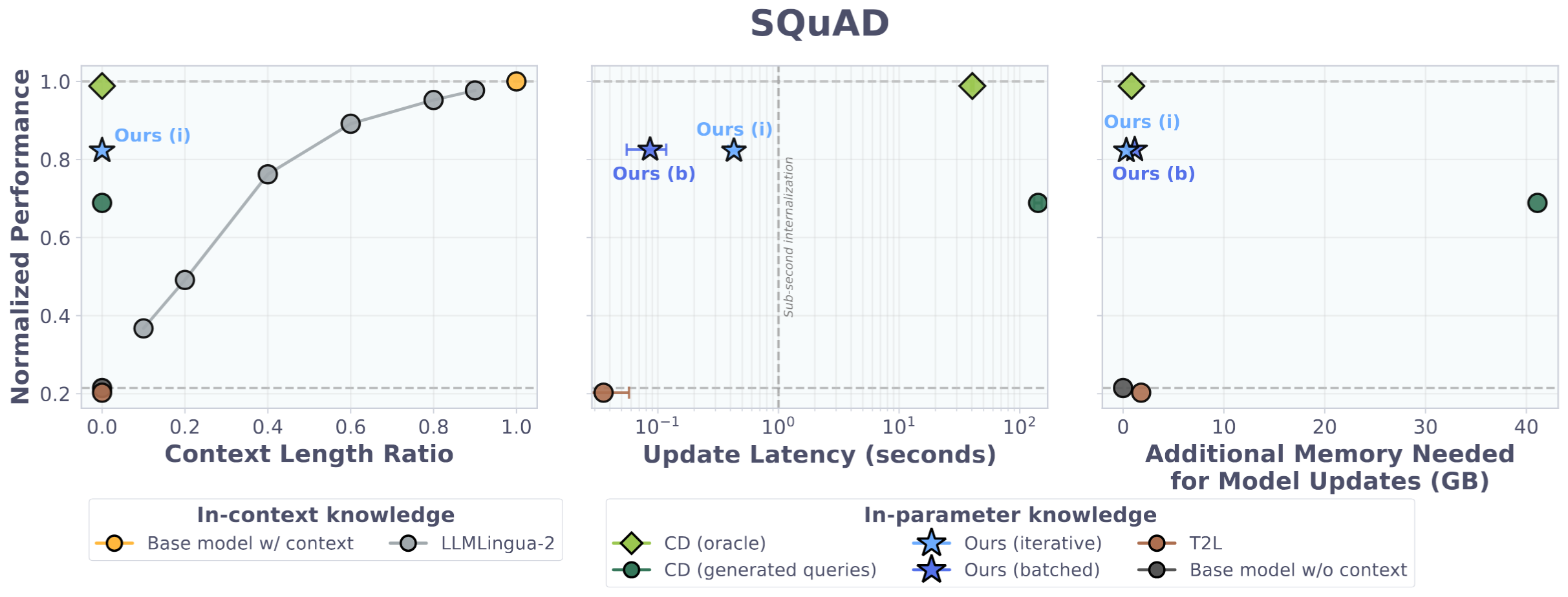 Next, we evaluate Doc-to-LoRA on real-world reading comprehension benchmarks. In this blog post, we show SQuAD performance relative to the base model with full in-context access and other relevant baselines.