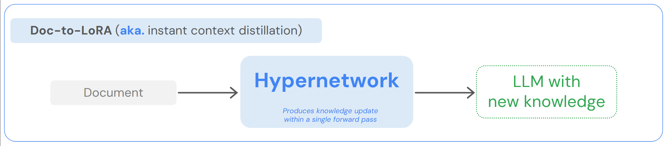 In our papers, this concept is implemented as a two-phase update cost amortization workflow, with a clean separation of costs. First, at meta-training time (expensive, done once), we train a hypernetwork that learns how to generate effective LoRA updates from a given input. Then, at deployment time (cheap, done often), that input (a document or a task description) is fed to the hypernetwork, which returns a LoRA adapter in a single sub-second forward pass. Therefore, we can avoid the expensive per-task optimization pipeline entirely. While Doc-to-LoRA and Text-to-LoRA share this update cost amortization framework, they differ in what they learn and how they are used: