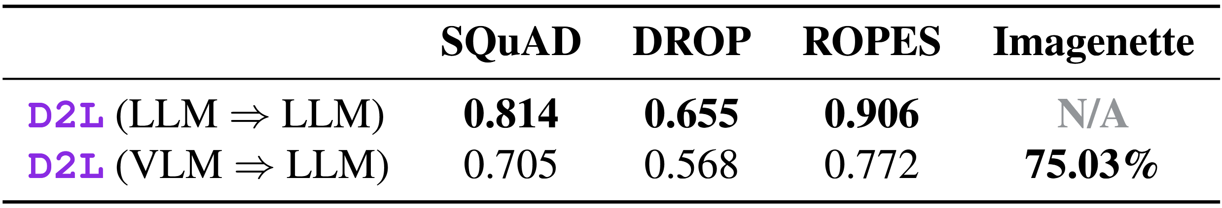 Thus, in this experiment, we test an extreme form of “internalization”: can a text-only model answer questions about an image processed by a VLM without ever giving the text model anything beyond the internalized information? Specifically, we train another hypernetwork instance using a VLM (Gemma-3-4b-it) as the document encoder and never include any images during the training phase of the hypernetwork. Thus, this experiment tests Doc-to-LoRA's zero-shot capability to encode visual information into LoRA.