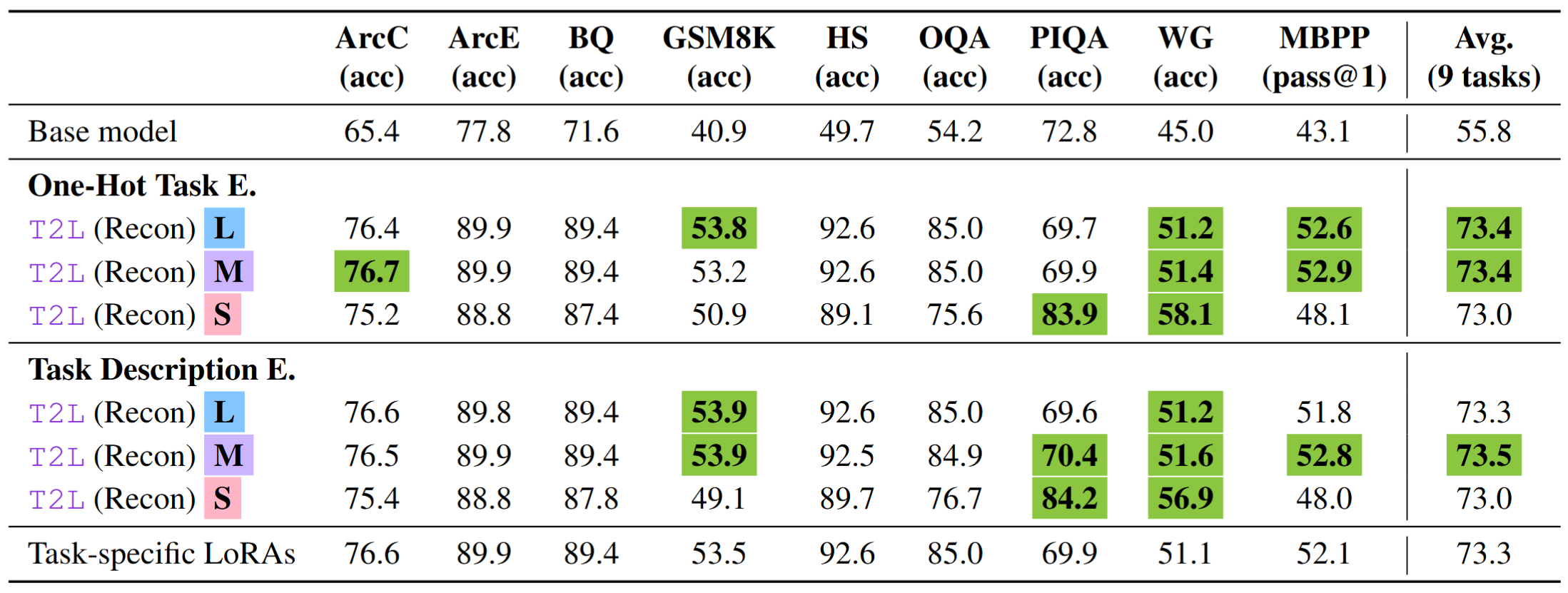 Reconstruction training is essentially adapter-library compression. Instead of storing many task-specific adapters, we store one hypernetwork that can regenerate them from descriptions. It's a sanity check to confirm that Text-to-LoRA can learn to reproduce known weights. On seen tasks, reconstruction-trained Text-to-LoRA recovers most of the task-specific performance--sometimes even matching the original adapter. The issue is that reproducing known weights isn't the same as learning a robust description-to-LoRA mapping that generalizes to new tasks.