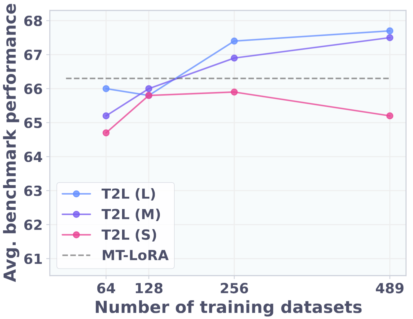 We also observe a clear scaling trend where larger hypernetworks and more training data produce better, more generalizable instances. This confirms that the hypernetwork "adapter generator" scales well--larger models and more data lead to better text-to-adapter mappings. See our paper for full details on architecture, experiments, ablations, and analyses.