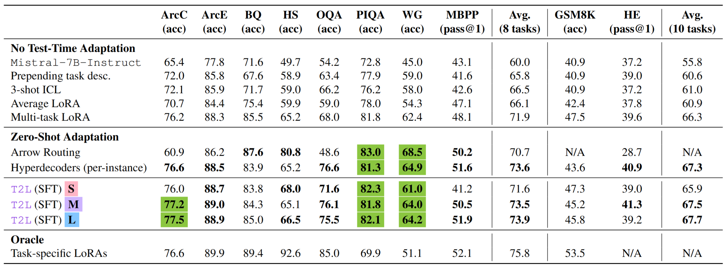SFT training addresses the core question of whether we can generate useful adapters from unseen task descriptions. We train on 479 diverse tasks from the Lots-of-LoRAs dataset. This diversity teaches the hypernetwork a general mapping from natural-language task descriptions to corresponding model updates. Even without oracle adapters to guide training, SFT-trained Text-to-LoRA generates adapters that beat the base model and outperform baselines on held-out tasks.