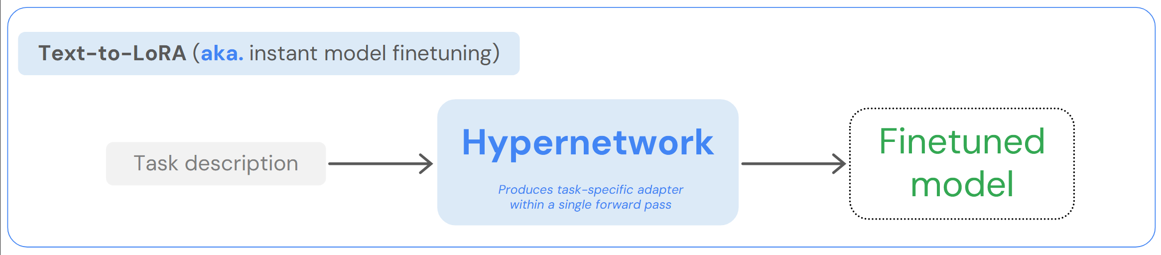While Doc-to-LoRA targets the long-term memory problem, Text-to-LoRA targets adaptation. Adapting LLMs via fine-tuning requires collecting or synthesizing data, curating it carefully, and running a training job. Each iteration through that loop is slow, manual, and expensive. Furthermore, the result is a single adapter tightly coupled to one specific dataset. Text-to-LoRA asks whether a hypernetwork can meta-learn the entire fine-tuning pipeline. Given only a natural-language description of a task, can it generate a useful LoRA adapter in a single forward pass? If so, then per-task adaptation cost disappears, replaced by a one-time upfront meta-training investment in the hypernetwork itself. During deployment, adaptation and task specialization become as simple as writing a description.