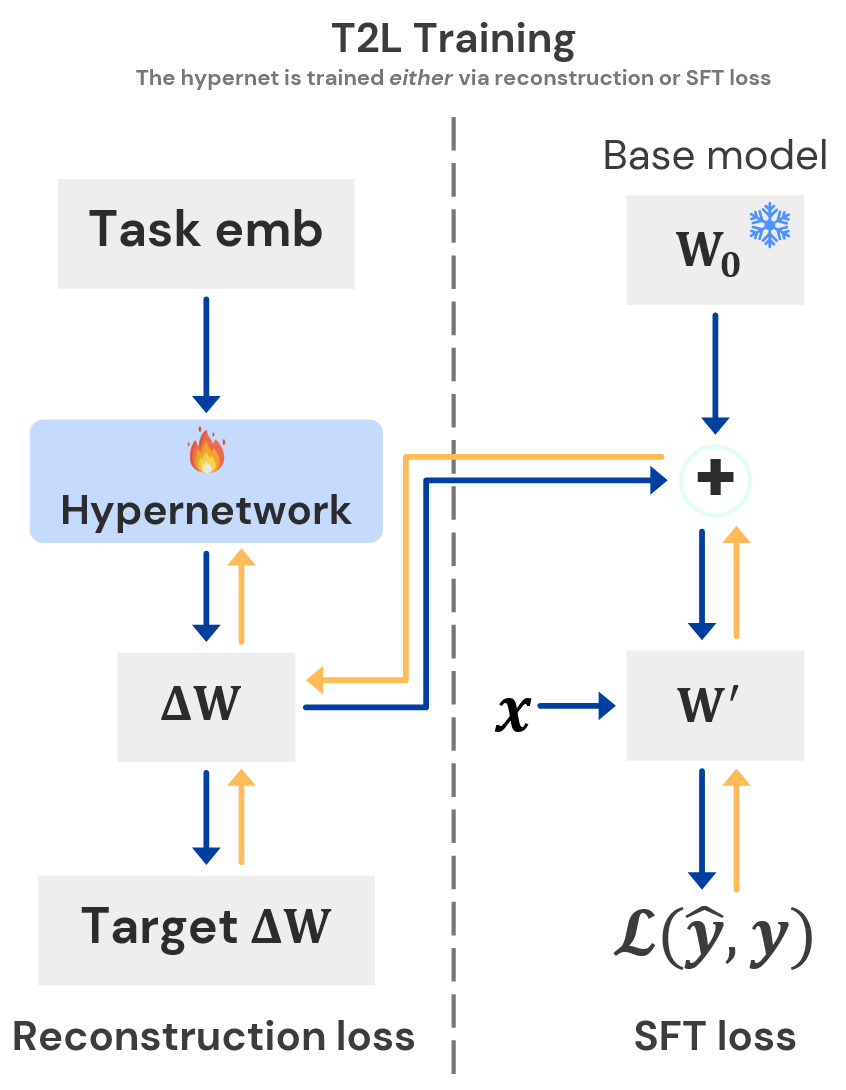This training setup captures the same paradigm shift presented in the introduction. Instead of optimizing a new adapter for every task at deployment time, we train one generator that can predict adapters on demand. Concretely, a task description is first encoded into a task embedding and the hypernetwork outputs all target LoRA weights in one forward pass. In our paper, we explore two objectives. In reconstruction training, Text-to-LoRA learns to match existing task-specific LoRA adapters. In SFT training, Text-to-LoRA is trained end-to-end through downstream task loss. That is, generated adapters are applied to a frozen base model, and gradients update the hypernetwork directly without requiring intermediate target adapters.